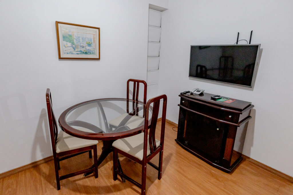 O apartamento conta com frigobar, cofre eletrônico, telefone e uma Smart TV de 40” com resolução 4K e Wi-Fi integrado, para que você aproveite seus programas favoritos com total qualidade. O ar-condicionado, combinado ao ventilador de teto, garante conforto térmico em qualquer estação.