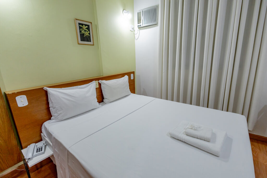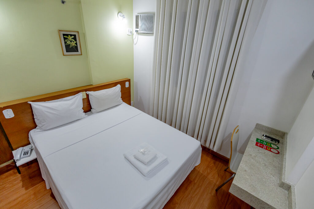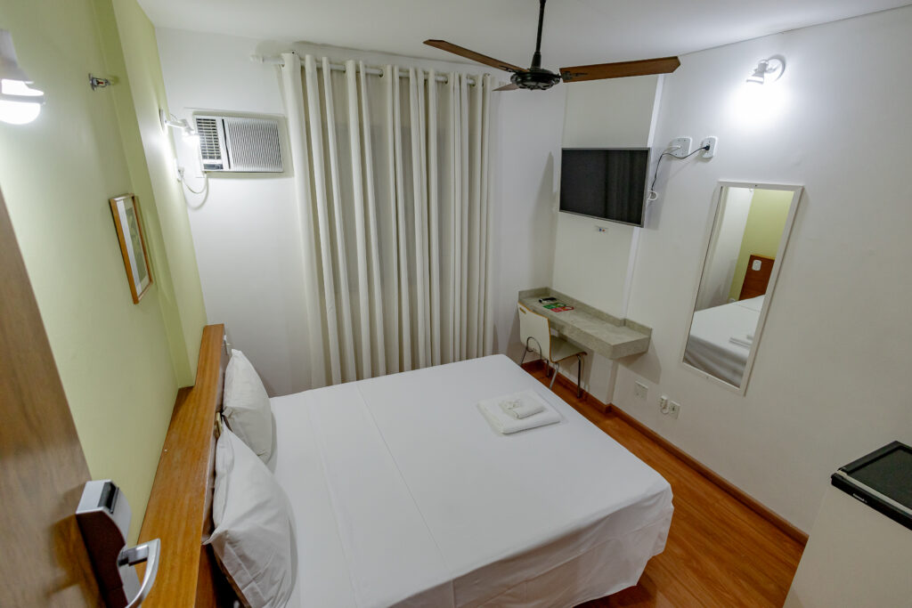 O ambiente conta com frigobar, cofre eletrônico, telefone e uma Smart TV de 40” em resolução 4K com Wi-Fi integrado, garantindo entretenimento e conveniência durante a estadia. O ar-condicionado, o ventilador de teto e o Wi-Fi gratuito completam a experiência, tornando esta categoria uma excelente escolha para quem deseja boa localização e serviços essenciais com ótimo custo-benefício.